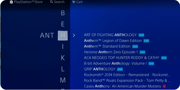 Alphabetized list for games with a slider for letter selection. Initially designed for a small library, research confirmed that the design did not scale and was a barrier for most markets.